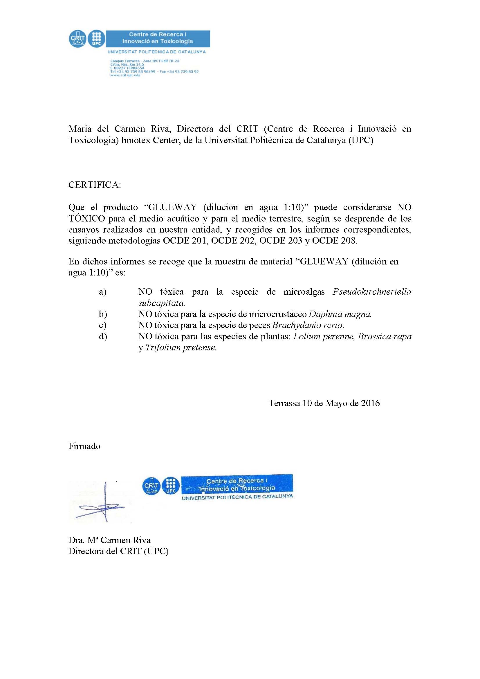 GlueWay Estabilizador de suelos, en sus dosificaciones recomendadas, es considerado como producto no tóxico e inocuo para el medio acuático y terrestre, según ensayos externos realizados por la Universidad Politécnica de Barcelona (UPC) siguiendo las metodologías OCDE 201, 202, 203 y 208.
